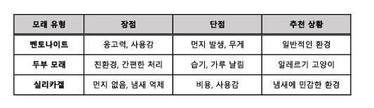 * 비용: 다른 모래보다 상대적으로 비쌈