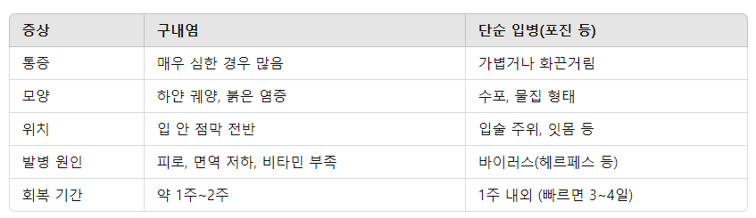구내염이나 입병 모두 자가면역력과 영양 상태에 큰 영향을 받기 때문에 충분한 휴식과 균형 잡힌 식사가 우선입니다.