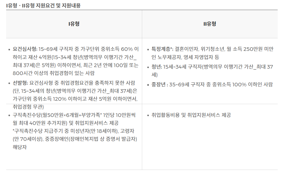 가구단위 중위소득* 60% 이하이고 재산 4억원(15~34세 청년(병역의무 이행기간 가산_최대 37세)은 5억원) 이하이면서, 최근 2년 안에 100일 또는 800시간 이상의 취업경험이 있는 사람을 중심으로 합니다.
