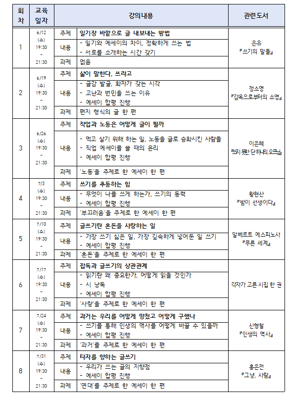 - 해당 프로그램은 매 회차 관련도서 읽어오기와 에세이 쓰기 과제가 있습니다. 신청전에 확인부탁드립니다