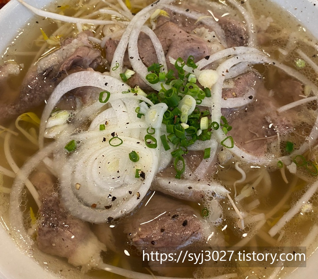 파의 은은한 단맛과 숙주의 식감이 쌀국수와 잘 어우러집니다.
