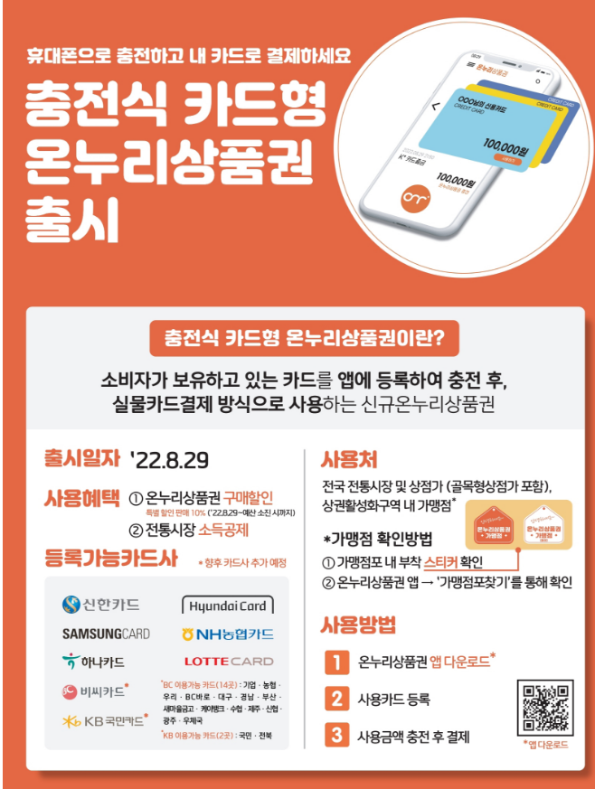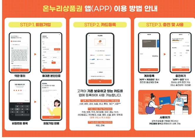 온누리상품권 앱(APP)에서 카드 및 계좌 등록 후 금액을 충전해 등록한 카드로 가맹점에서 사용 - 가맹점